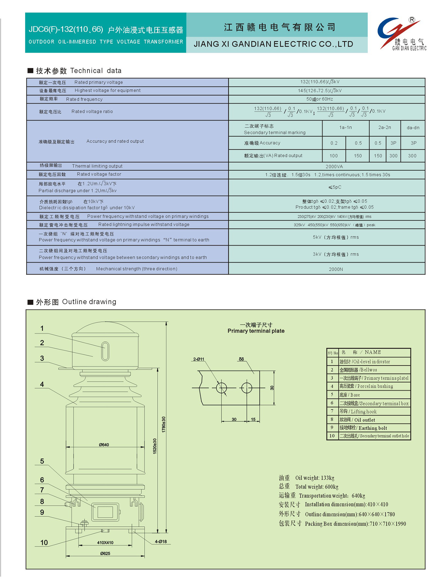 JDC6(F)-132(110、66) 户外油浸式电压互感器