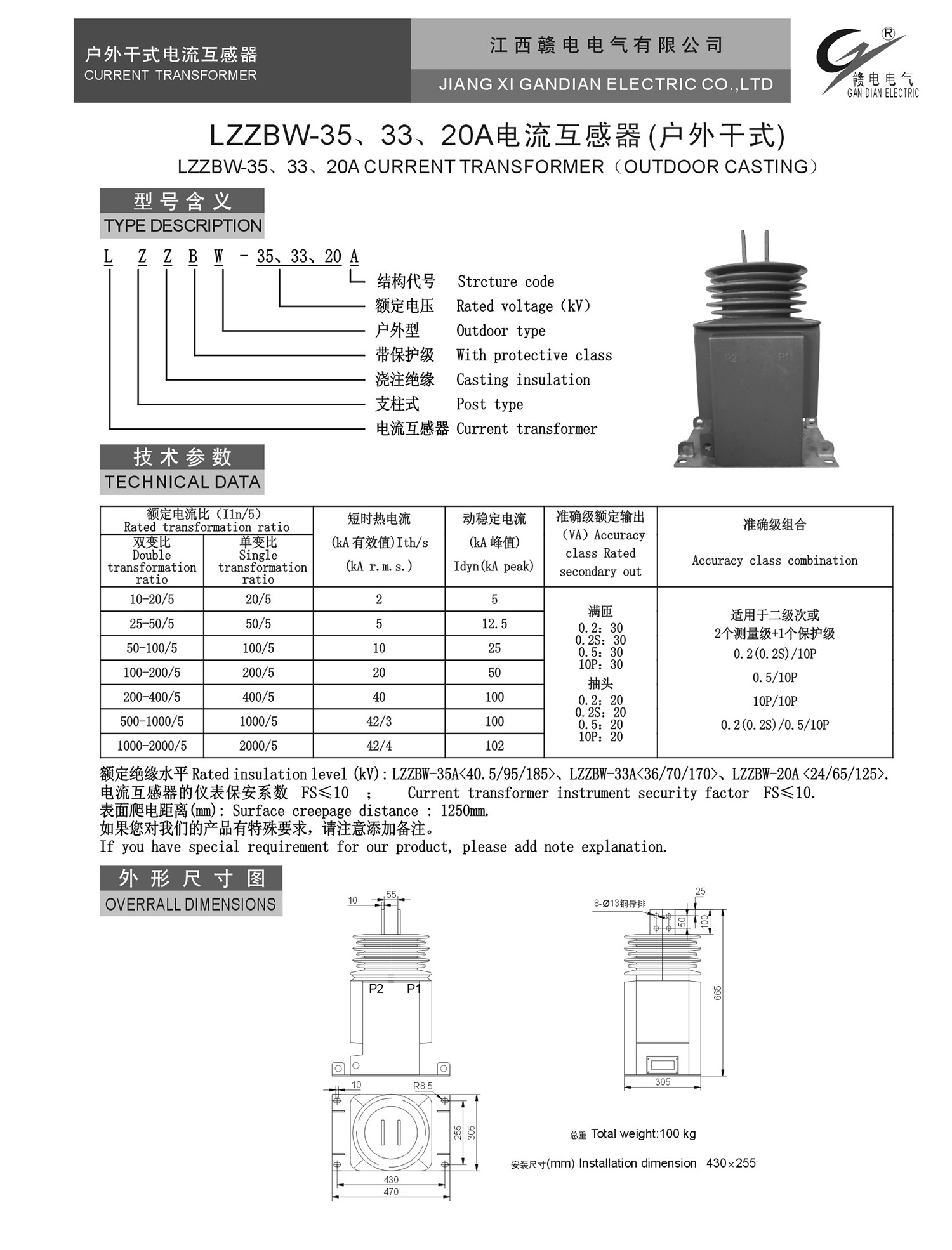 LZZBW-35、33、20A 电流互感器(户外干式)